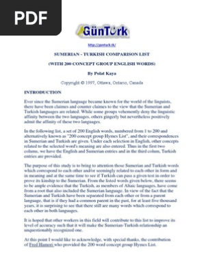 English Sumerian Turkish 200 Words Comparison List Pdf Document