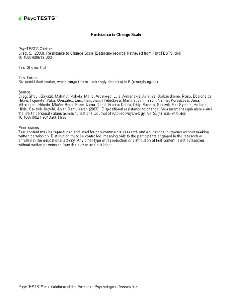 Resistance To Change Scale Self Scoring Mind Clinical Psychology