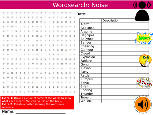 Noise Wordsearch Puzzle Sheet Keywords Settler Starter Cover Lesson Synonyms Sound Science English Teaching Resources