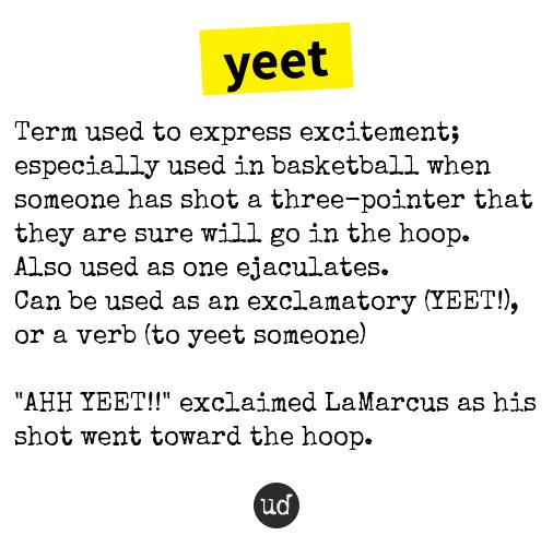 Urban Dictionary On Twitter Jscelfo66 Yeet Term Used To Express Excitement Especially Used In Basketball Http T Co Xtttsjxhzt Http T Co Ndfozsrjkl